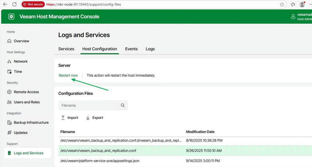 - Access the Veeam Host Management Console Web UI (username/password + MFA)