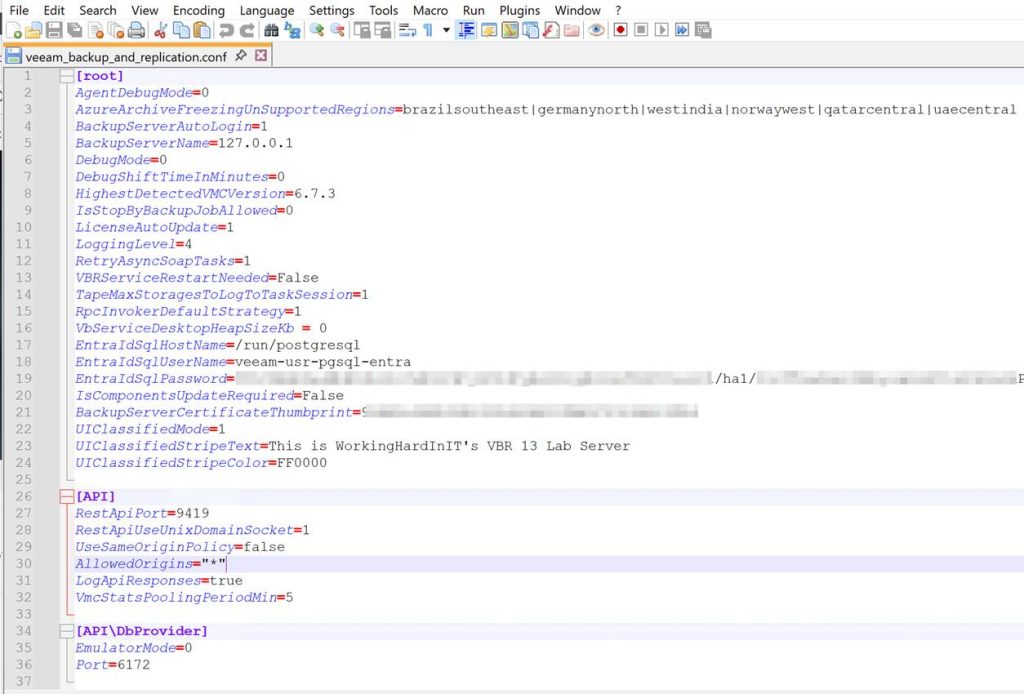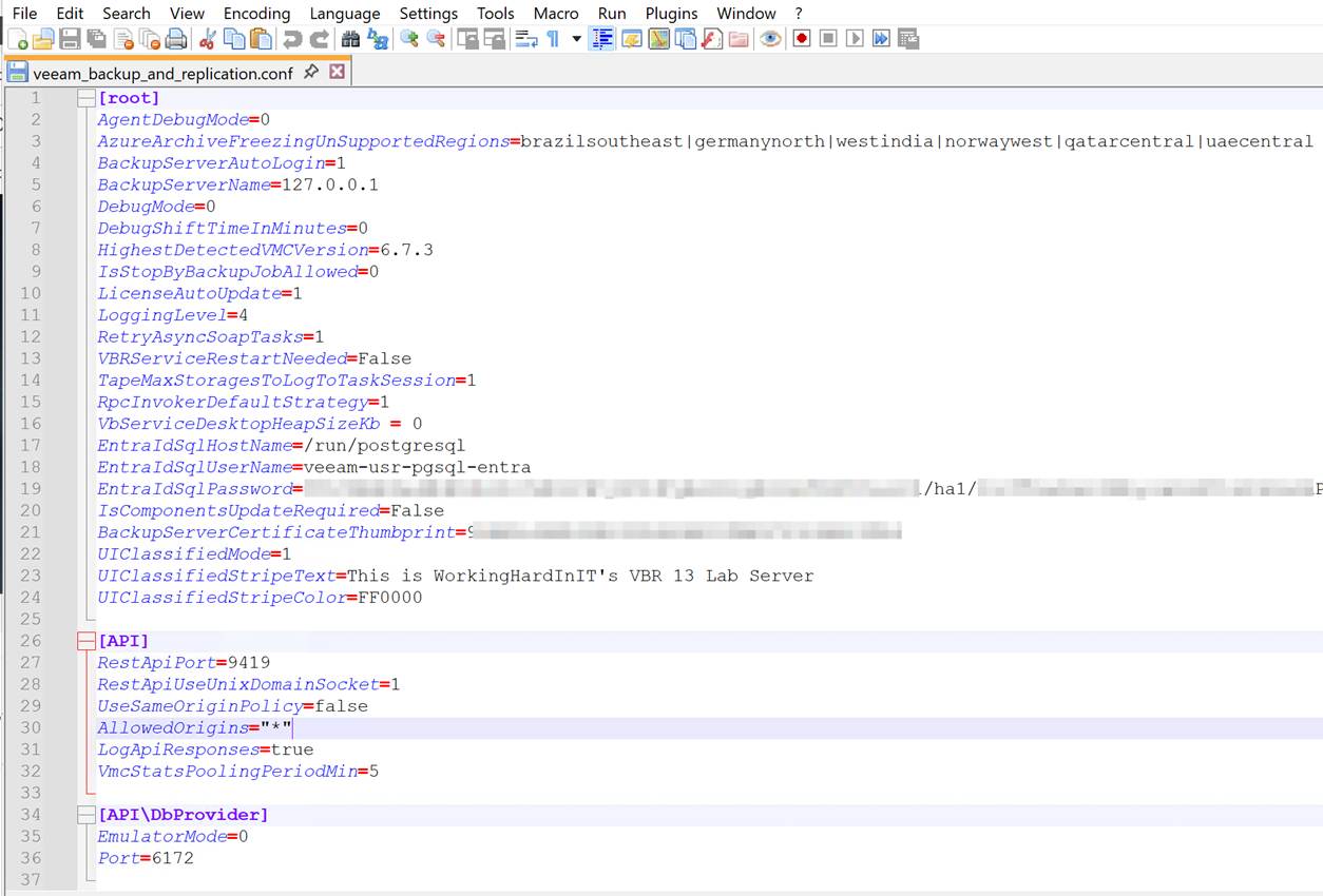 The configuration files consist of different sections in square brackets (e.g., [root]). Where [root] is the equivalent of the root of the listed key. Below, I list some examples that you will find in the /etc/veeam/veeam_backup_and_replication.conf file.