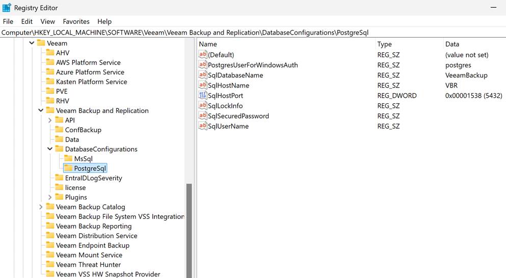 - [DatabaseConfigurations\PostgreSql] = HKLM\SOFTWARE\Veeam\Veeam Backup and Replication\DatabaseConfigurations\PostgreSql\
