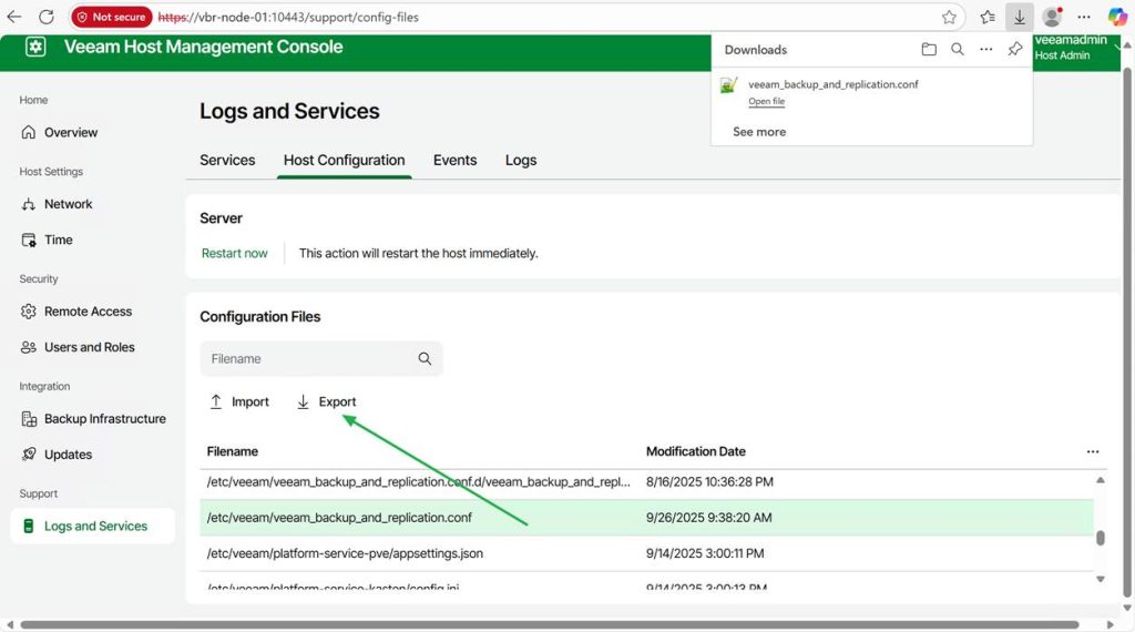 The config files can be exported and imported via the Web GUI. Import required Veeam security officer approval if that is configured.