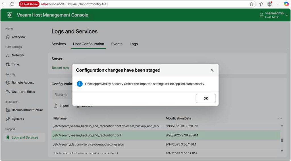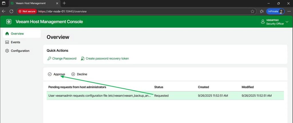 Now the Veeam security officer has to log on to the appliance web console and approve my request